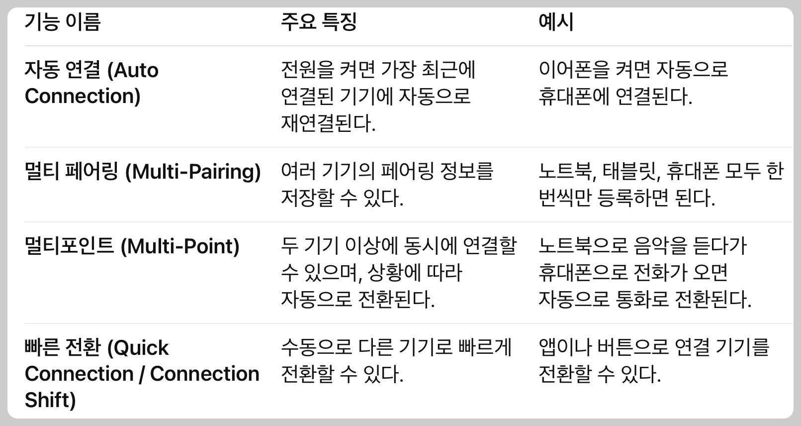 제조사마다 명칭이 다를 수 있으므로, 제품 설명에서 “멀티포인트 지원” 또는 “자동 연결 기능 탑재” 등의 문구를 확인하는 것이 좋다.